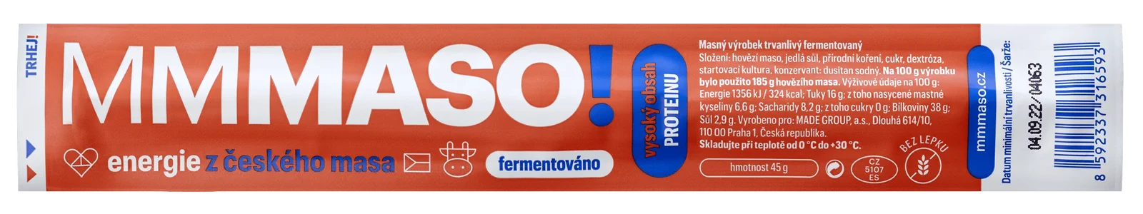 V každých 100 g MMMASA je 38 g živočišných bílkovin. Používáme výhradně hovězí z českých chovů. MMMASO neobsahuje lepek ani zbytečné přísady. O tuhle svačinku se můžeš podělit i s dětmi.